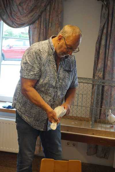 Dem Zuchtfreund Arne Ulrich konnte unter viel Applaus die silberne SV-Nadel überreicht werden. Danach besprach Manfred Gitz noch einige Mondtauben und gab hilfreiche Ratschläge.